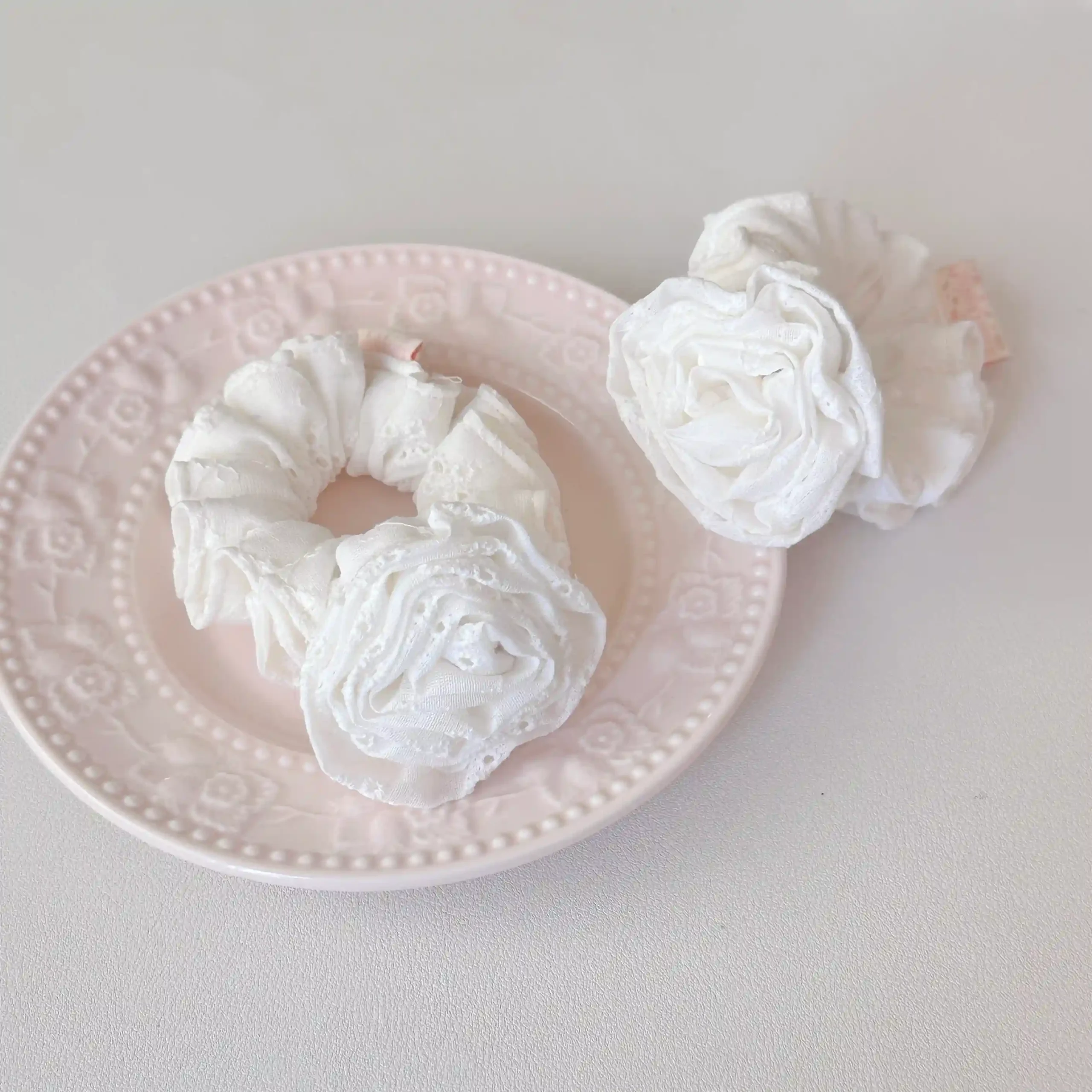 Soft handmade scrunchie crafted from delicate lace, shaped like a charming rose. Perfect for adding a romantic touch to your hairstyle. Exclusive to Lula, each piece is handmade in small batches, making every scrunchie unique.